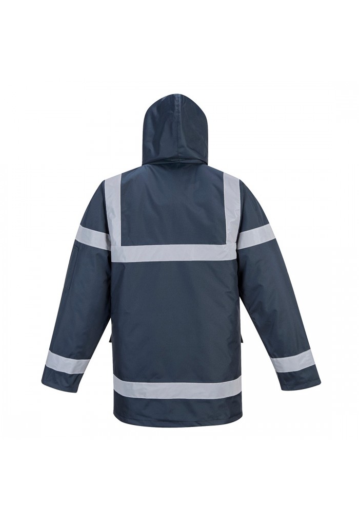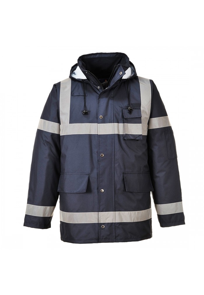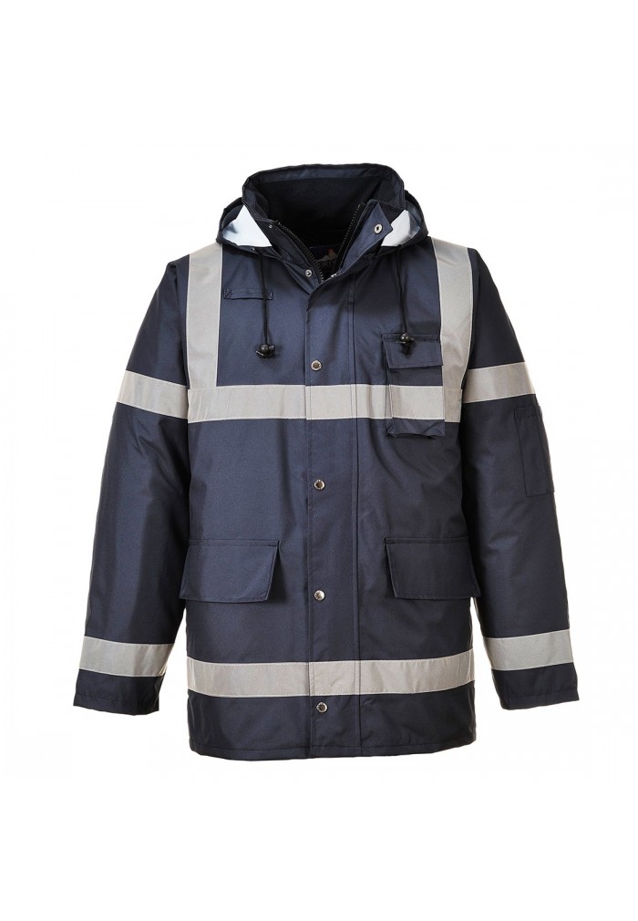 Produs de viibilitate inalta. Caracteristici: buzunare spatioase buunar suport telefon mobil/radio gluga cu snur.