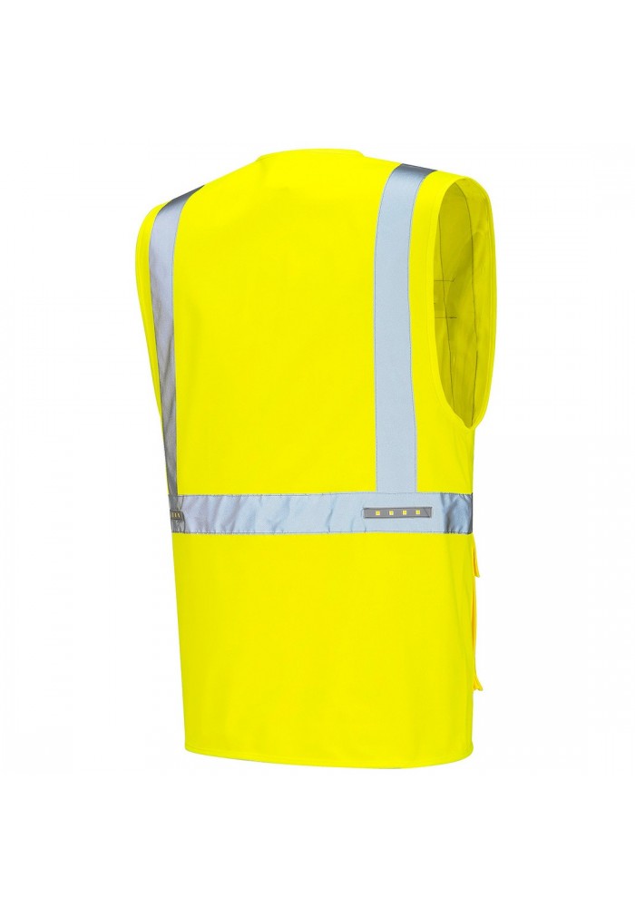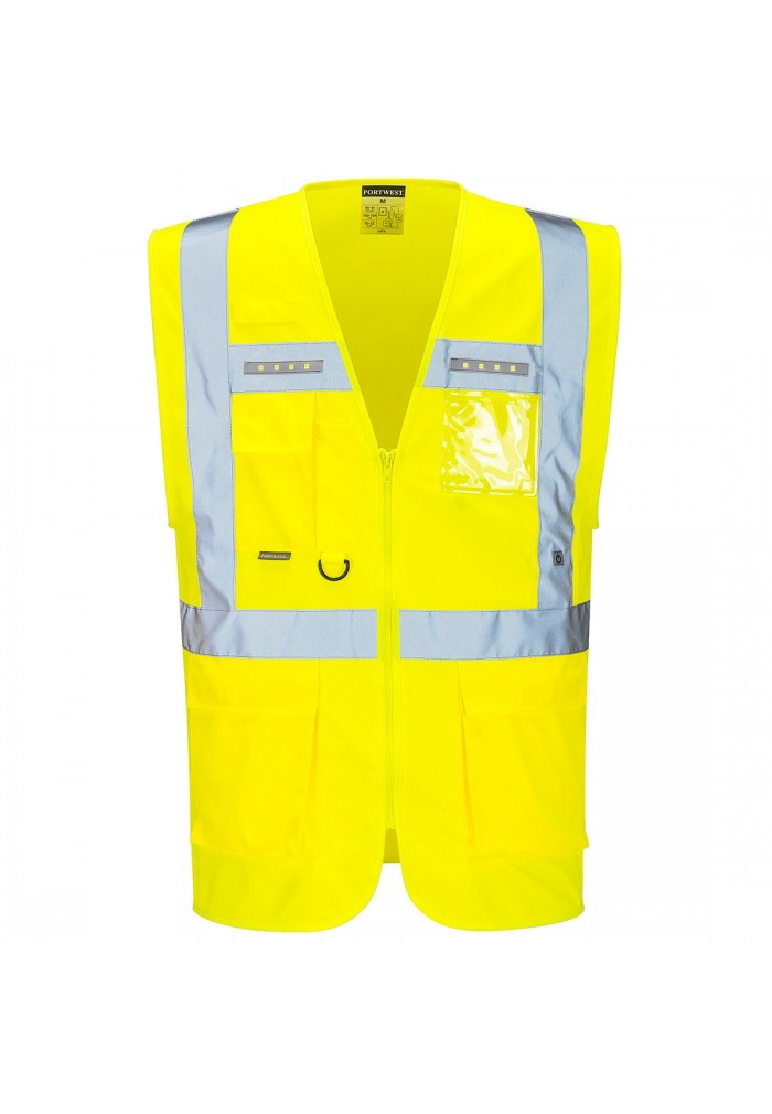 Aceats vesta executive prezinta LEDurile integrate inovative pentru vizibilitate superioare. Buzunarele multiple confera spatii ample de depozitare. Un buzunar ID transparent completeaza caracteristicile acestei veste unica
